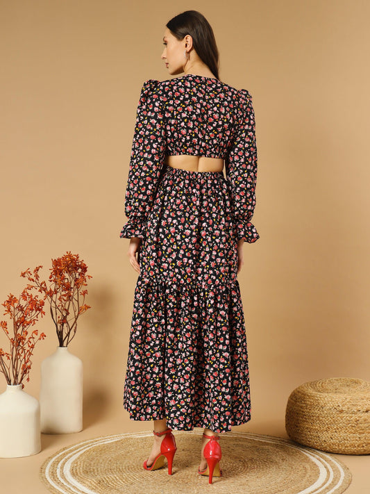Rhombus Flowery V-Neck Long Dress With Back Cut-Out